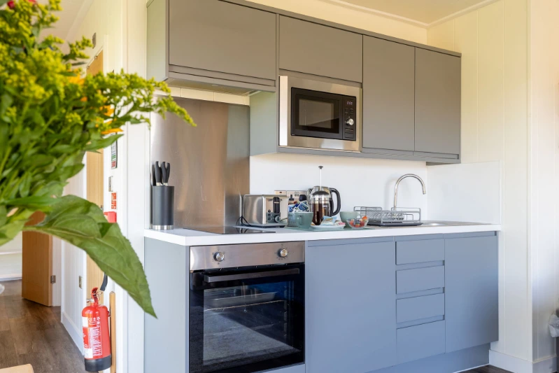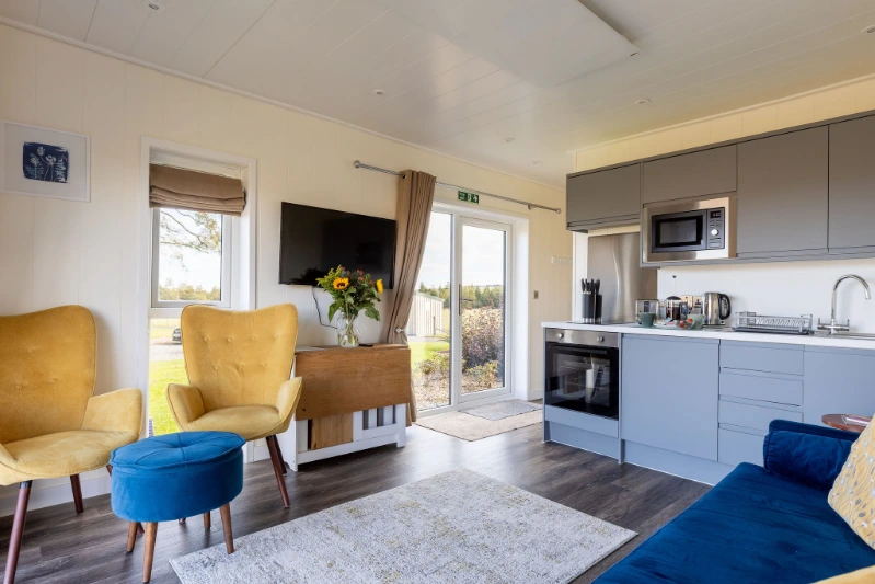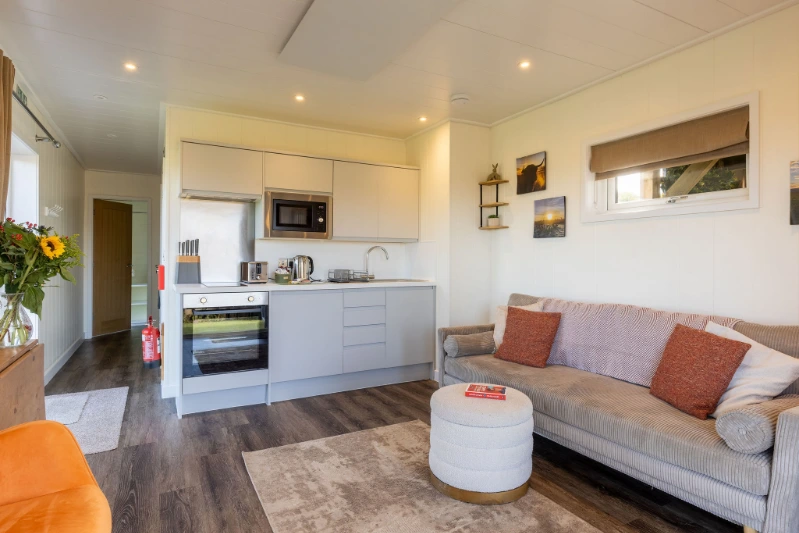 - There’s a spacious open plan living area with a fully equipped kitchen, fridge freezer, cooker with hob and microwave.